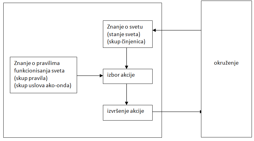 Sve ovo je dosta sažeto opisano, ali svakako daje osnov za dalje razumevanje. Jednostavna skica strukture agenta je na slici ispod. Vidimo da agent, u opštem slučaju, preko senzora percipira trenutno stanje sveta oko njega i smešta to u neki oblik baze znanja. Na osnovu znanja o svetu oko sebe i na osnovu pravila po kojima svet funkcioniše bot donosi odluku šta će sledeće da uradi. Tu odluku zatim prenosi na aktuatore i izvršava izabranu radnju.
