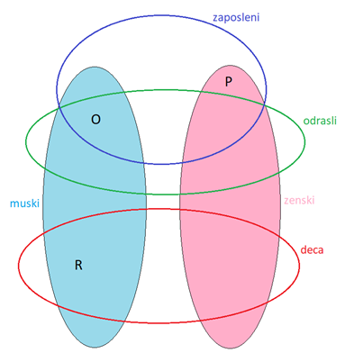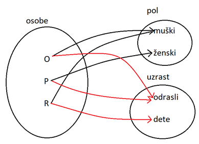 Možemo stvar da predstavimo i drugačije. Odrasli-dete su dve uzajamno isključive kategorije, osoba je ili jedno ili drugo, ne može da bude oba, niti nijedno. Isto važi i za muško i žensko – osoba je ili muško ili žensko, nema treće (da ne širimo temu na tu stranu sad). Osobe možemo da stavimo u skup osoba, i da ih relacijama povežemo na vrednosti (muško,žensko) u skupu P, odnosno (odrasli,dete) u skupu U. Tako dobijamo relacije kao na slici ispod. Tu onda možemo da definišemo funkcije pol(x) i uzrast(x) koje uzimaju osobu a vraćaju pridruženi pol/uzrast. Sa zaposlen(x) bismo imali true/false što nas nekako opet vraća na to da je zaposlen svojstvo, jer osobe ili jesu ili nisu zaposlene.