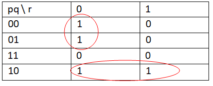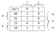 Pogledajmo poslednji red. Vidimo dve susedne jedinice. Za p=1, q=0 rezultat će biti 1 i za r=0 i za r=1, što znači da nije bitno šta je r – ako su p=1,q=0, iskaz je svakako tačan, u oba slučaja. Ovo je prostor za optimizaciju.