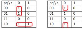 Nastavićemo sa levom optimizacijom. Vidimo da u gornjoj, uspravnoj, grupi parametar p=0, r=0, q ima ove vrednost, pa se q izbacuje. U donjoj grupi se izbacuje r. Svaka grupa postaće jedan DNF član. Tako dobijamo p=0, r=0 ili p=1, q=0, što daje