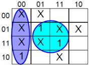 Rezultujući izraz ima dva člana. Tri X polja koja nisu obuhvaćena se ignorišu. Optimizovani izraz je: