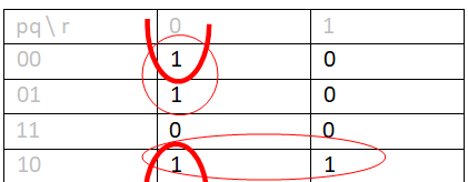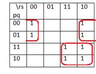 Ovako izdvojene grupe daju nam dva člana DNF. Prvi (gornja grupa) uklanja parametre q i r, a ostaju p=0 i s=0. Drugi, donji, uklanja parametre q i s, i ostaju p=1 i r=1. Dobijamo sledeći iskaz: